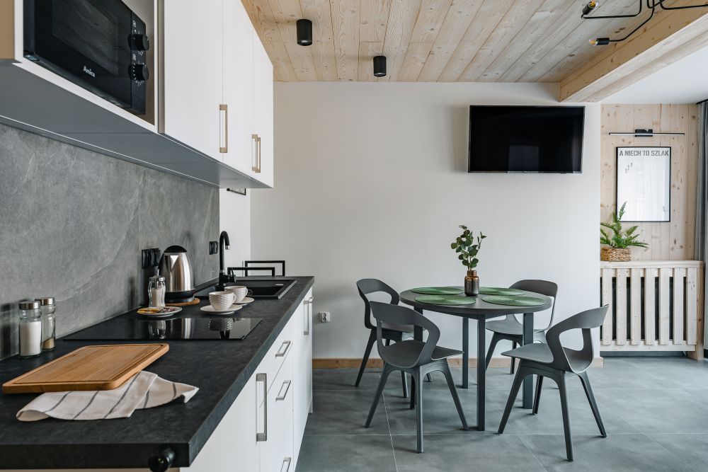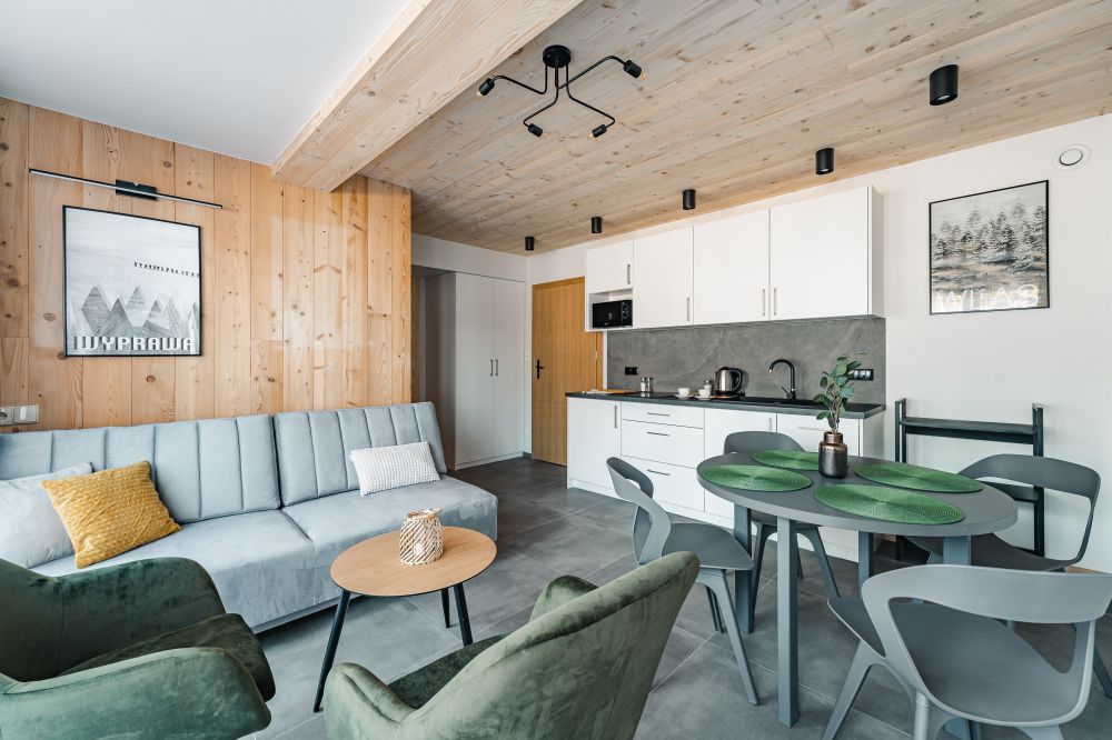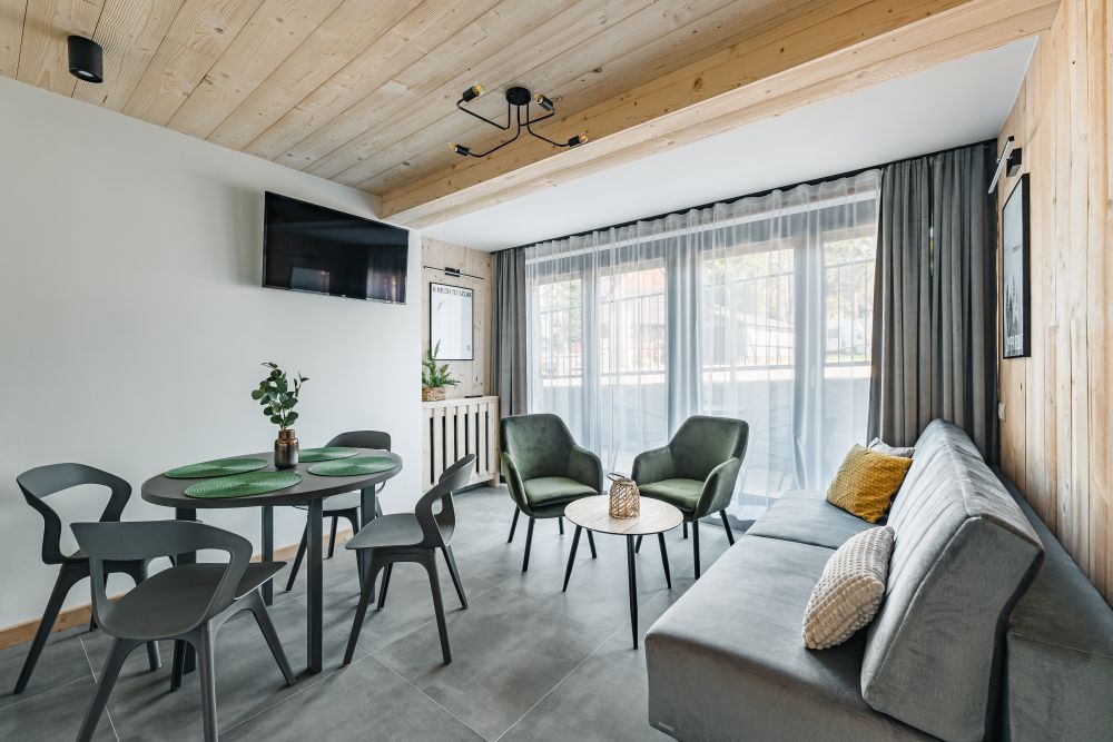 Apartament dla 4 osób, kompletnie i nowocześnie wyposażony z jedną sypialnią w stylu regionalnym, usytuowany na niskim parterze budynku. Mieści się w Willi Kozińcówka zlokalizowanej w dzielnicy Zakopanego Bystre-Koziniec w odległości ok. 1800m od górnej części ulicy Krupówki. Architektura budynku swoim charakterem nawiązuje do stylu zakopiańskiego i jednocześnie w nowoczesny sposób łączy elementy drewna, kamienia i stali. W skład apartamentu wchodzi: salon z częścią jadalną i rozkładaną kanapą dla dwóch osób, wydzielonej kuchni, sypialni, łazienki z kabiną prysznicową i balkonem.