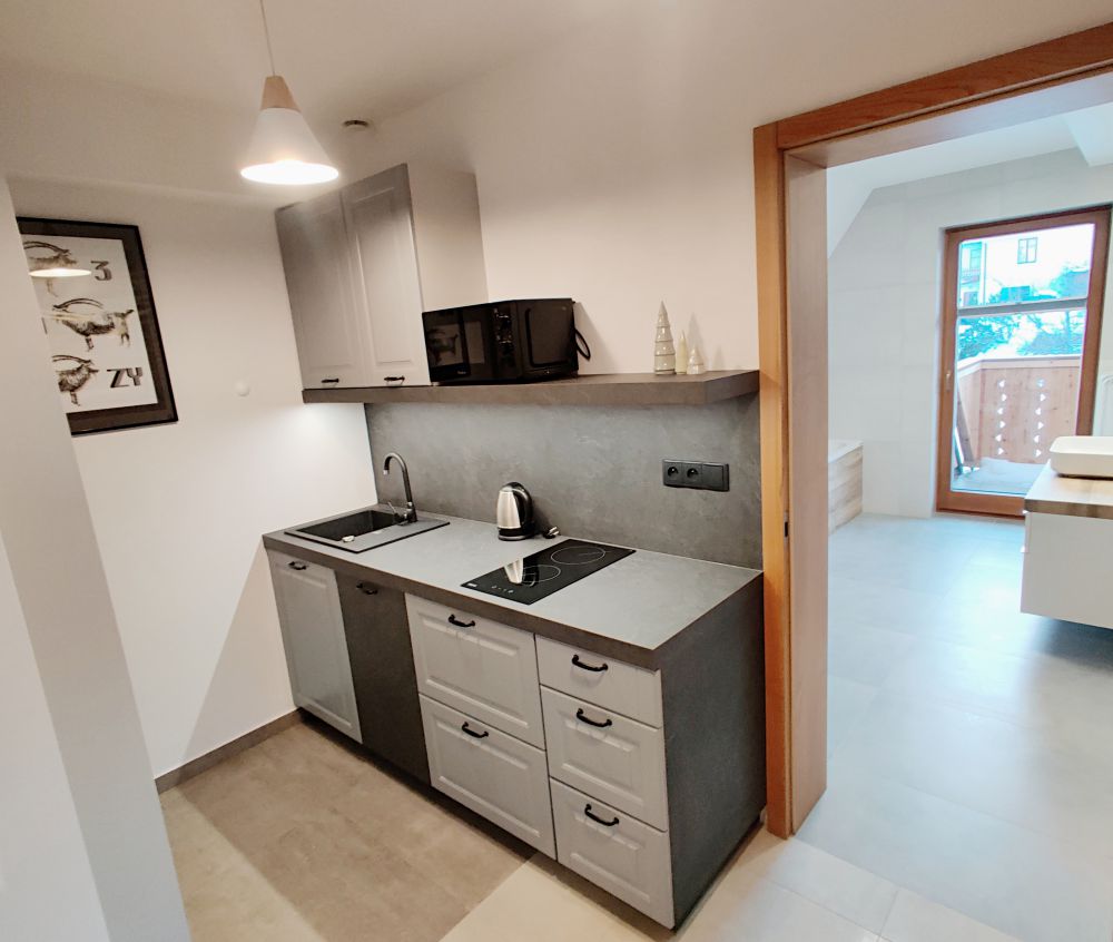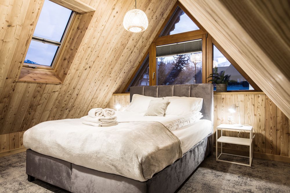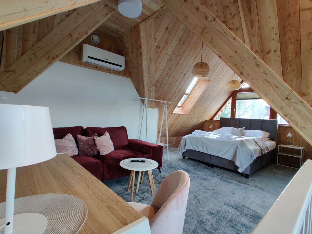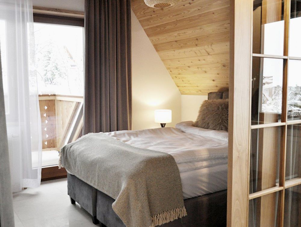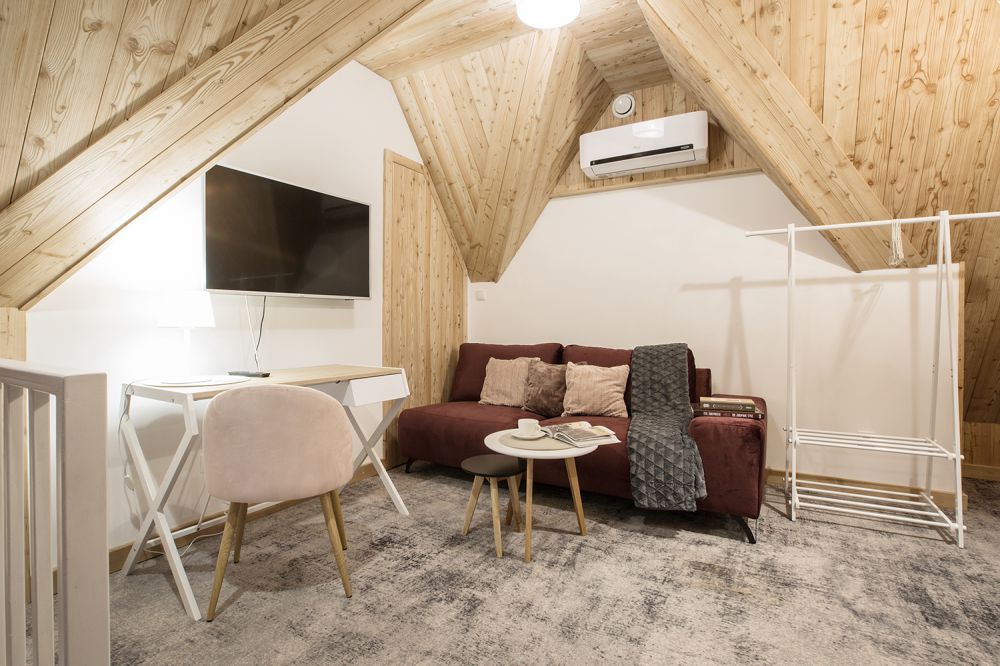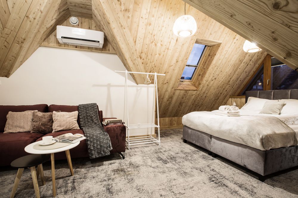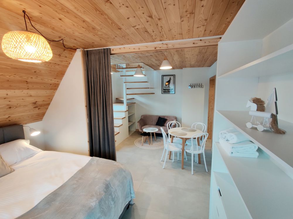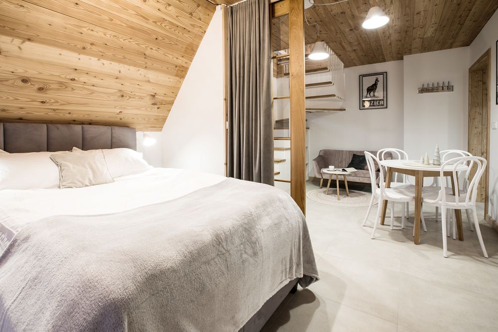 Apartament dwupoziomowy dla 5 osób, kompletnie i nowocześnie wyposażony z dwoma sypialniami w stylu regionalnym . Mieści się w Willi Kozińcówka zlokalizowanej w dzielnicy Zakopanego Bystre-Koziniec w odległości ok. 1800m od górnej części ulicy Krupówki. Architektura budynku swoim charakterem nawiązuje do stylu zakopiańskiego i jednocześnie w nowoczesny sposób łączy elementy drewna, kamienia i stali.