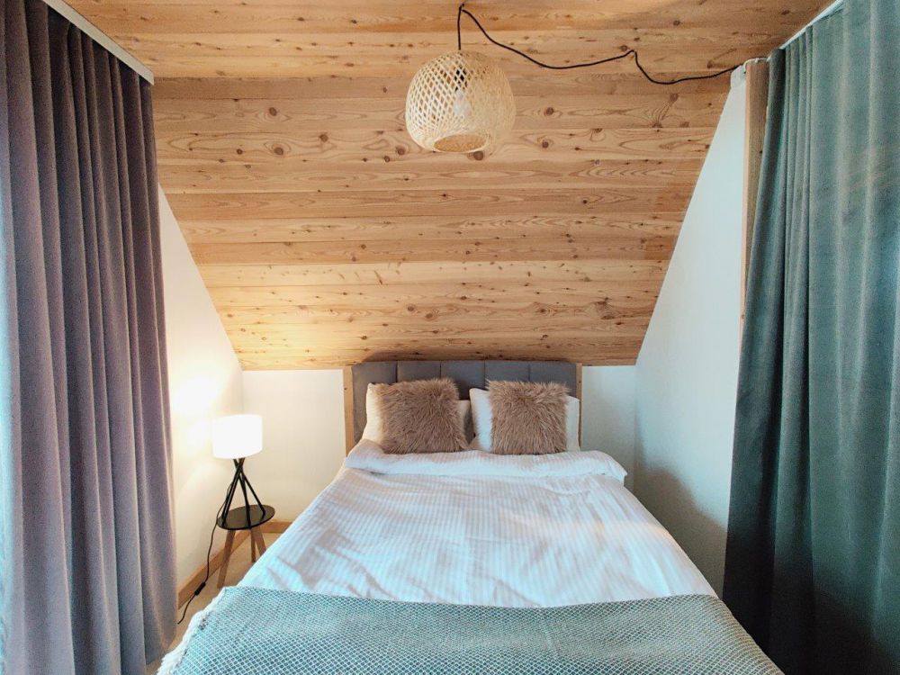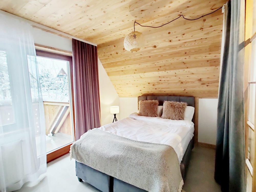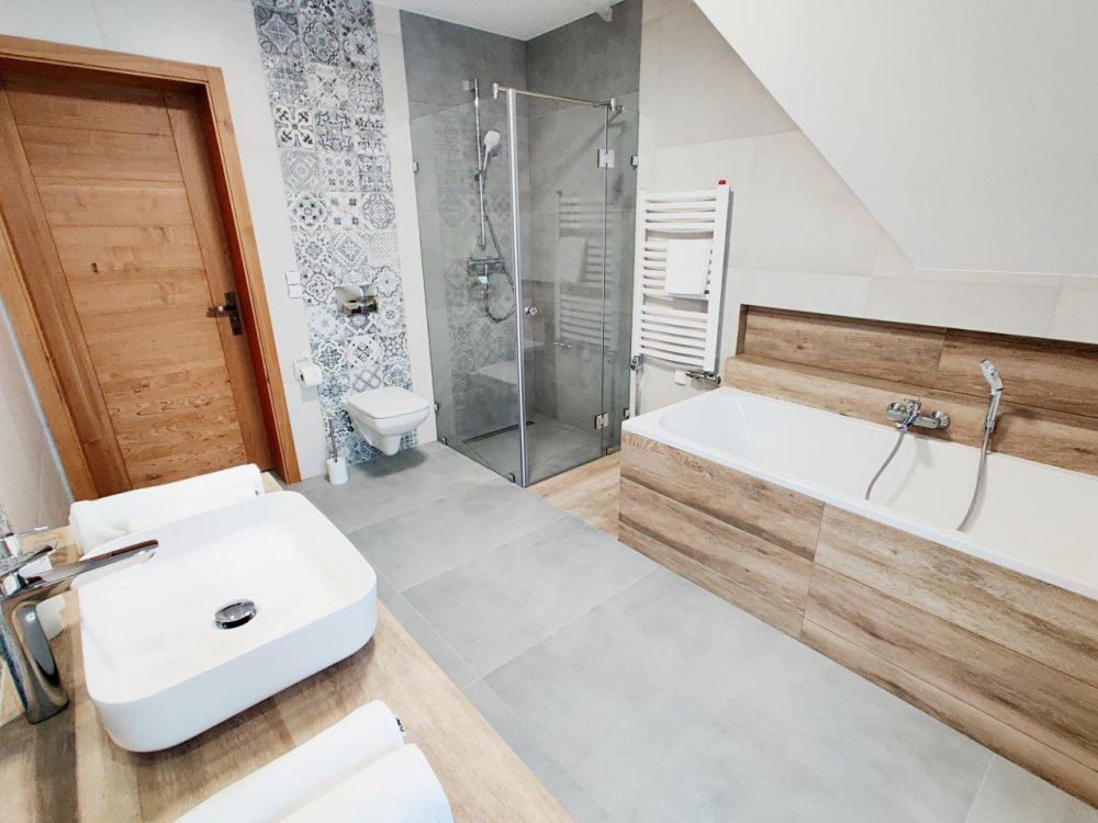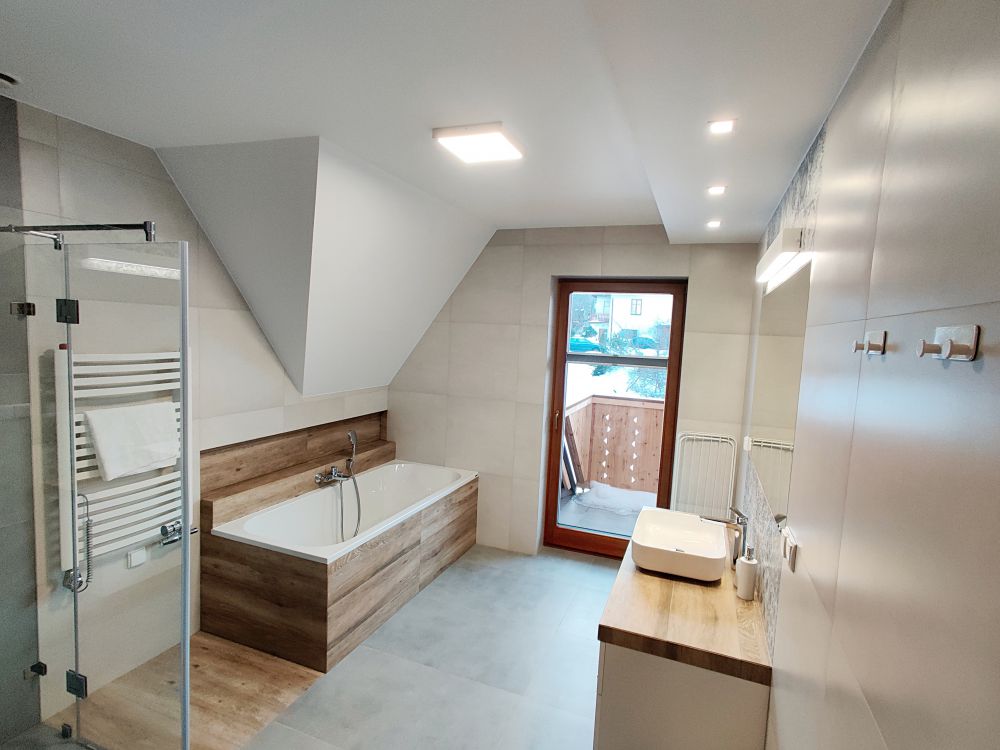Komfortowy, dwupoziomowy apartament z widokiem dla max 5 osób z dużą łazienką z wanną i prysznicem.