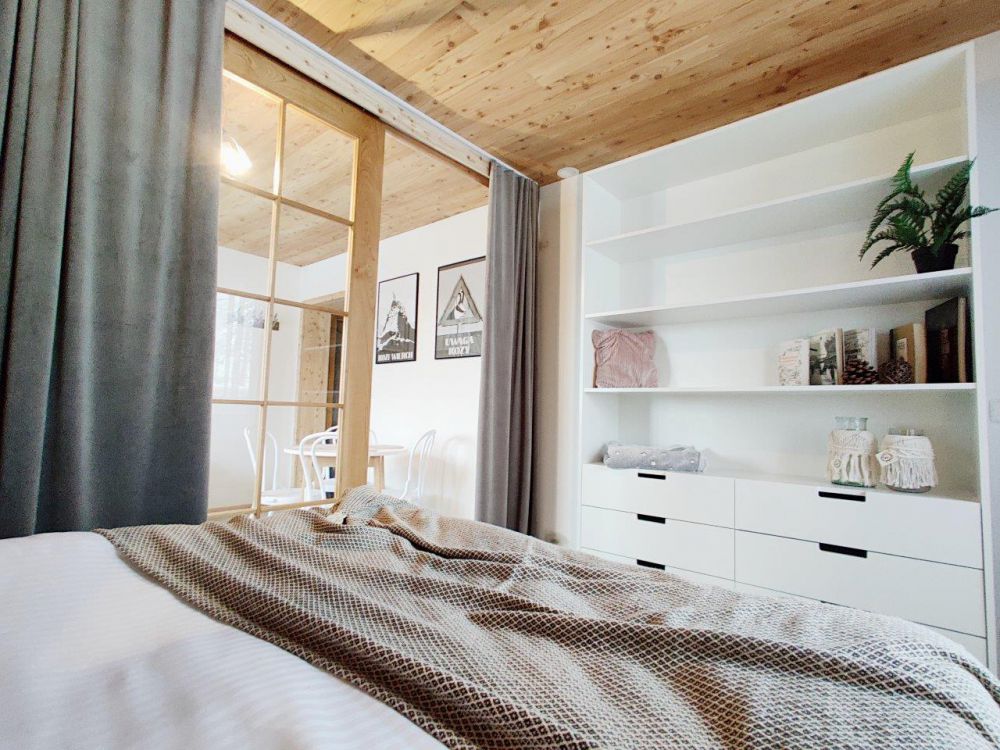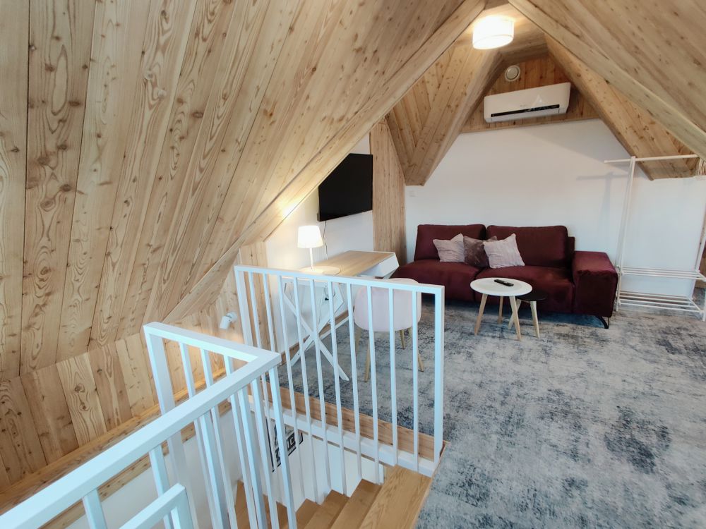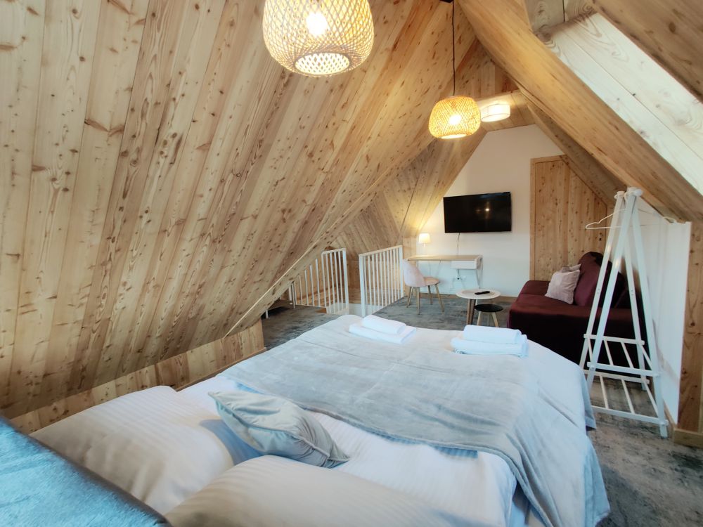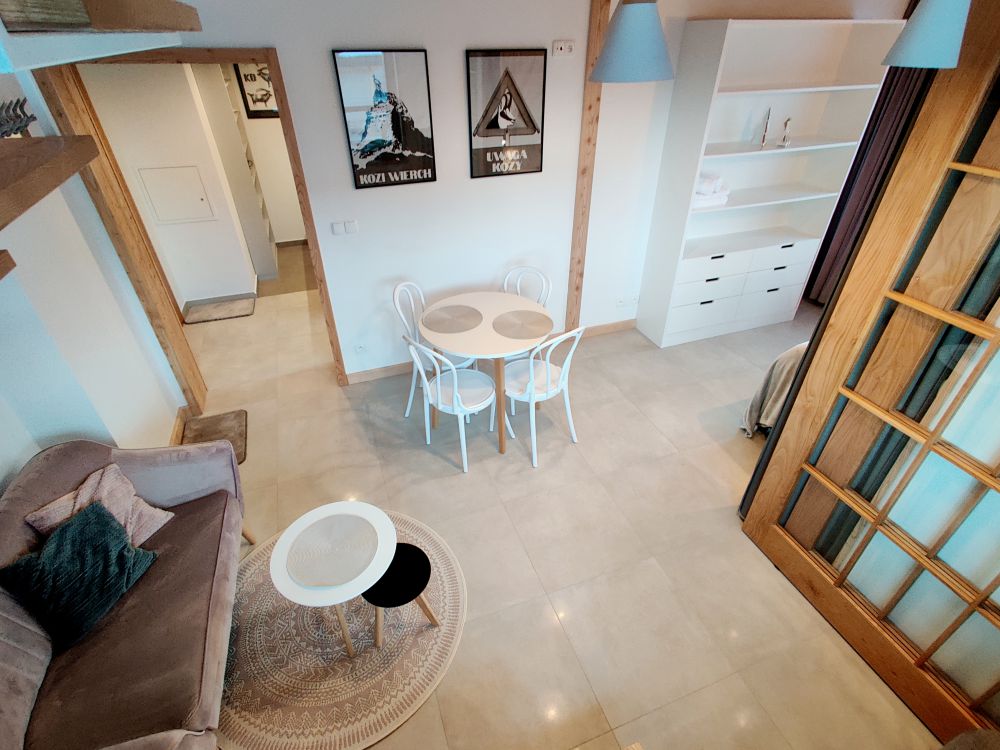 W skład apartamentu wchodzi: salon z sofą, wydzielony aneks kuchenny, dwie sypialnie- jedna górny druga dolny poziom i łazienka z kabiną prysznicową oraz wanną.