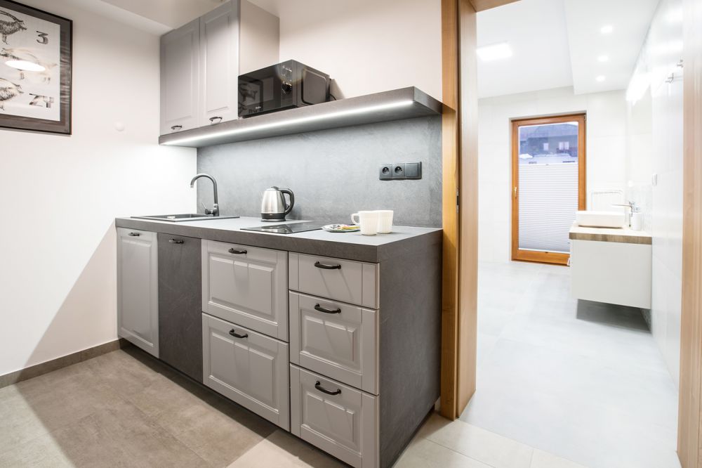 lodówka, płyta ceramiczna, kuchenka mikrofalowa, zmywarka, naczynia, sztućce, garnki, zlew, kieliszki do wina i wódki,