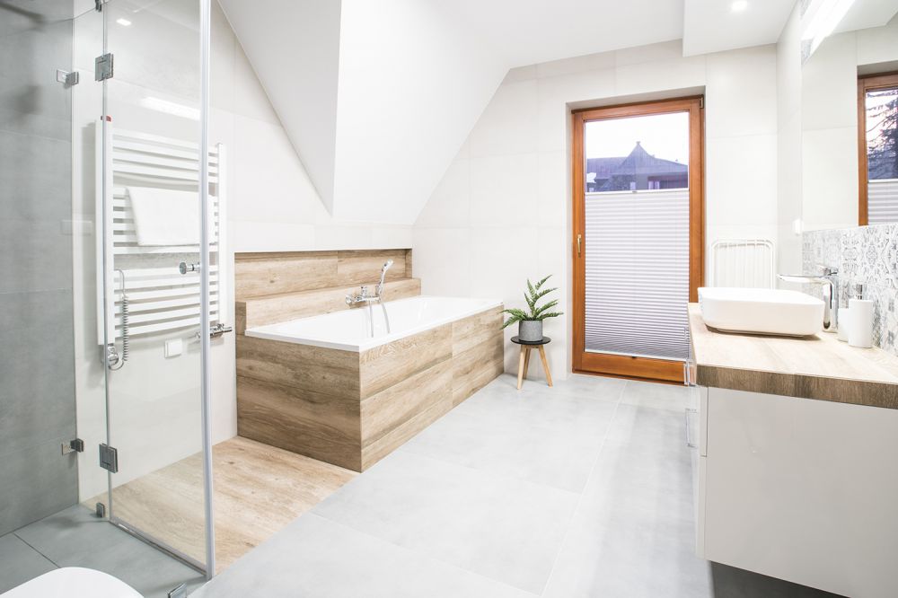 wanna, kabina prysznicowa, umywalka z szafką z szufladami, toaleta, ręcznikowiec, suszarka do włosów,