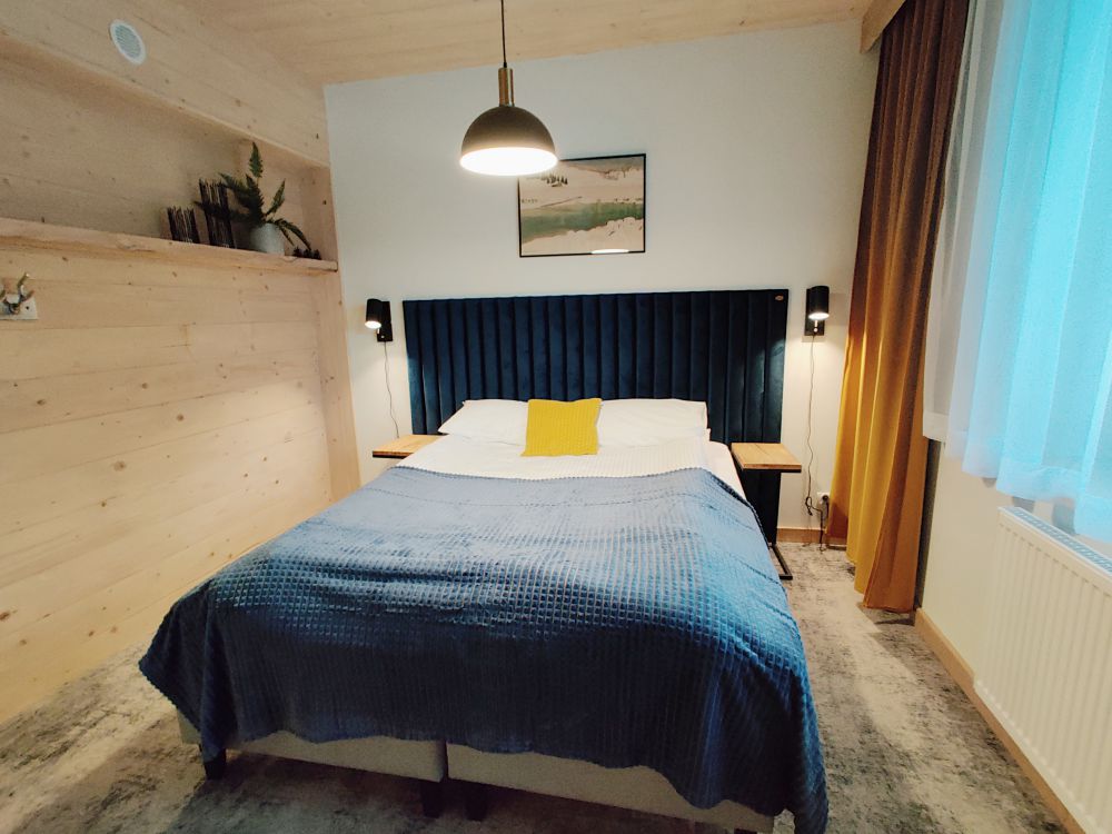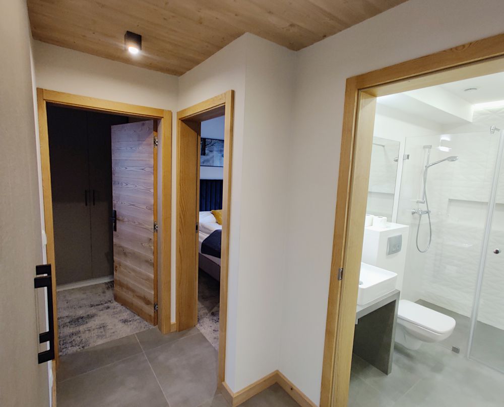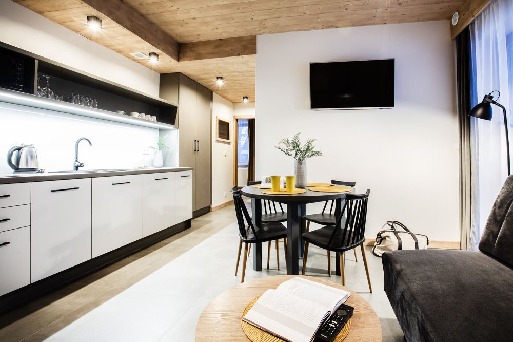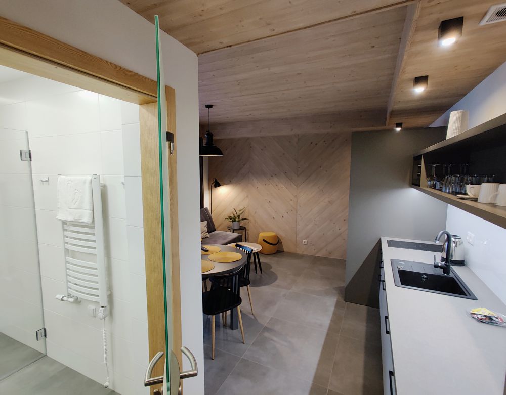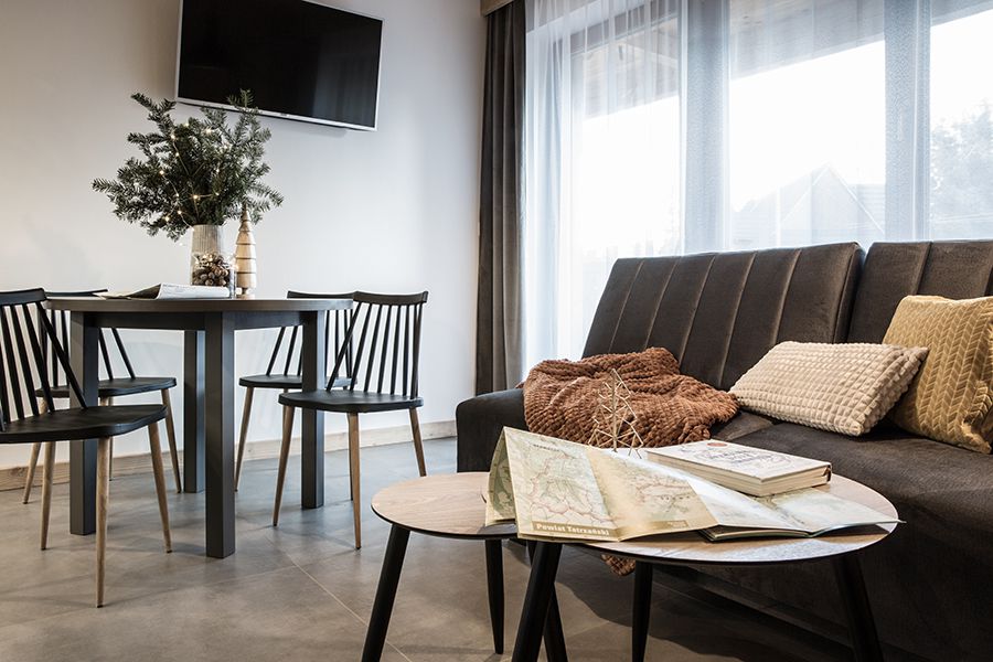 Apartament dla max. 5 osób, kompletnie i nowocześnie wyposażony z dwoma sypialniami w stylu regionalnym . Mieści się w Willi Kozińcówka zlokalizowanej w dzielnicy Zakopanego Bystre-Koziniec w odległości ok. 1800m od górnej części ulicy Krupówki. Architektura budynku swoim charakterem nawiązuje do stylu zakopiańskiego i jednocześnie w nowoczesny sposób łączy elementy drewna, kamienia i stali. W skład apartamentu wchodzi: salon z aneksem kuchennym i rozkładaną kanapą, dwie sypialnie , łazienka z kabiną prysznicową, balkon.