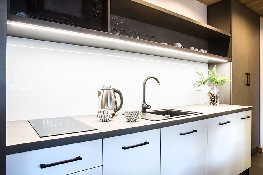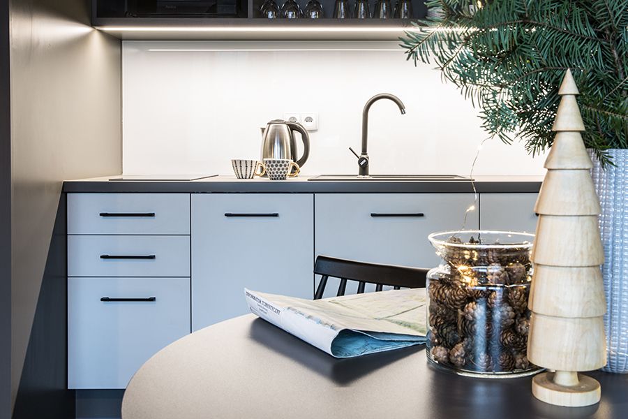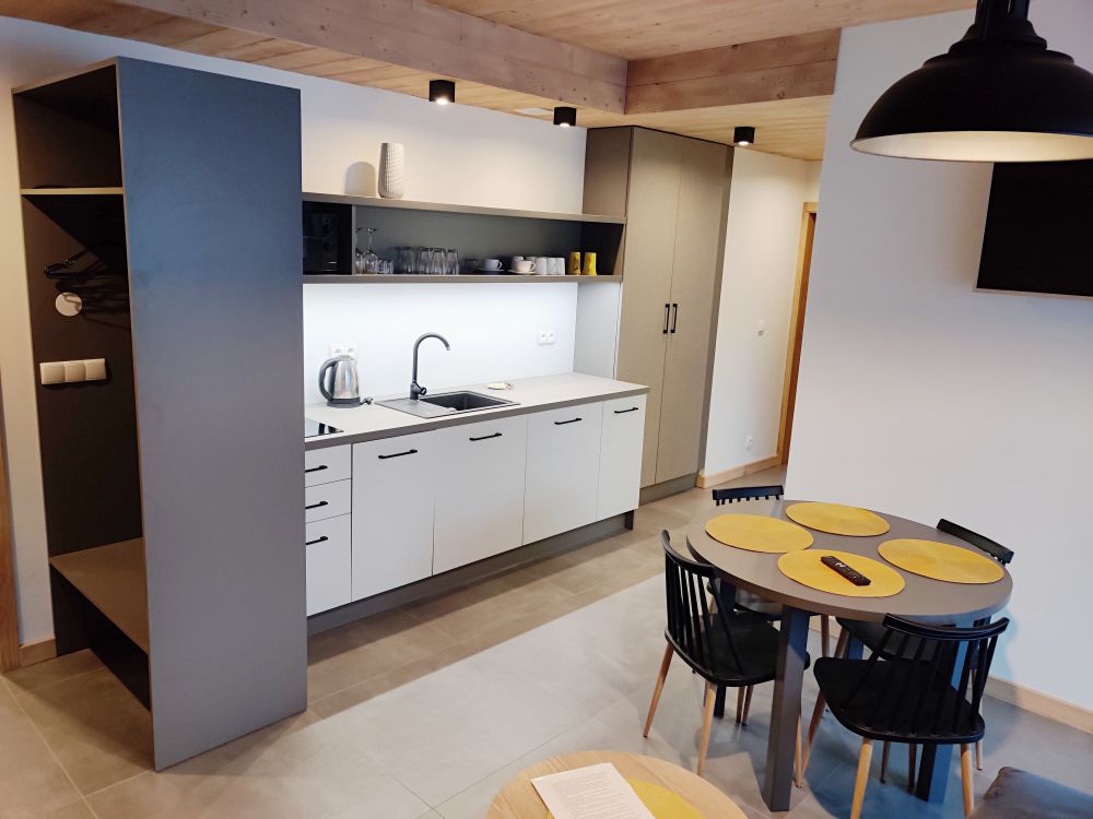 Aneks kuchenny: lodówka, płyta ceramiczna, kuchenka mikrofalowa,zmywarka, czajnik, naczynia, sztućce, garnki, zlew, kieliszki do wina i wódki