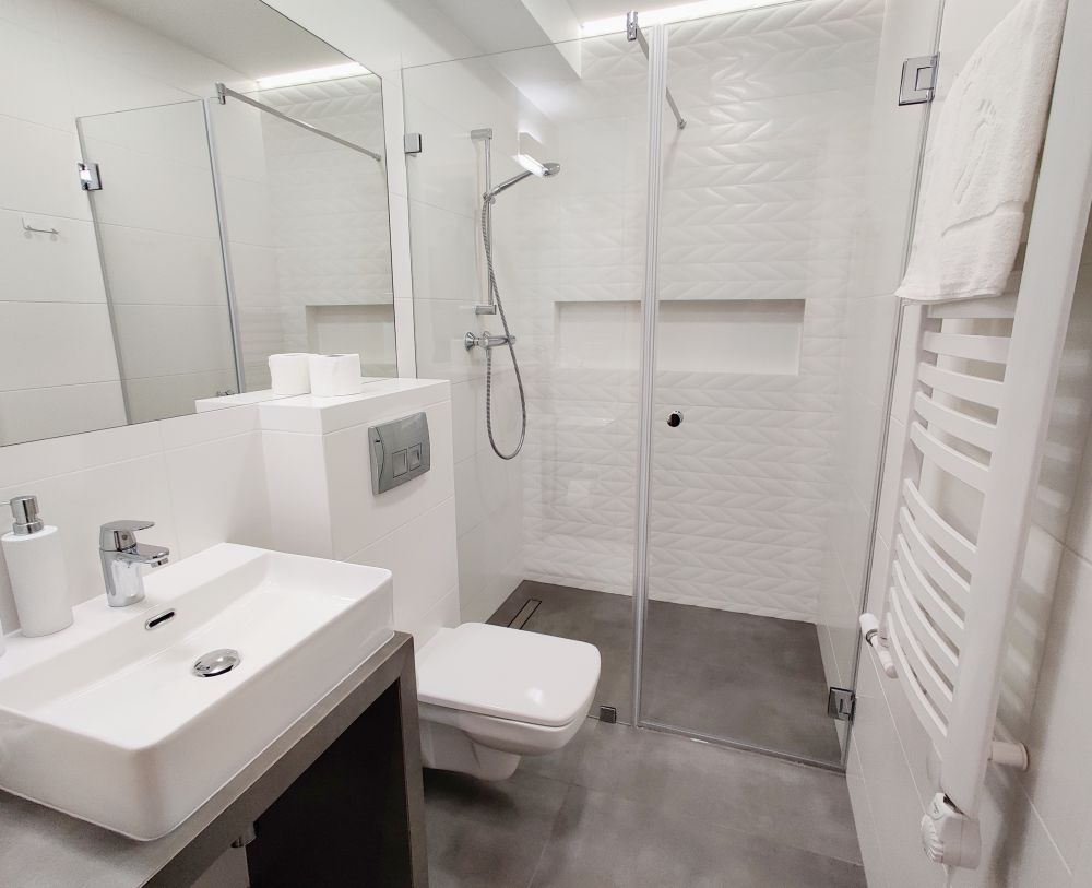 kabina prysznicowa, umywalka, toaleta, ręcznikowiec, suszarka do włosów