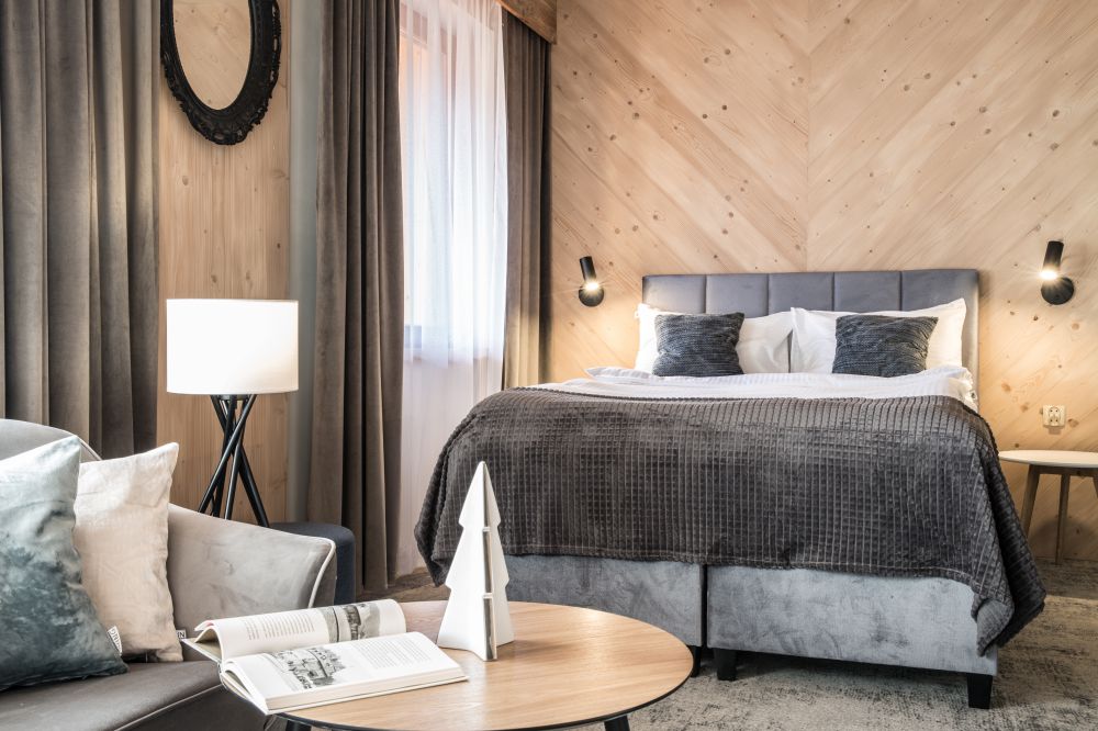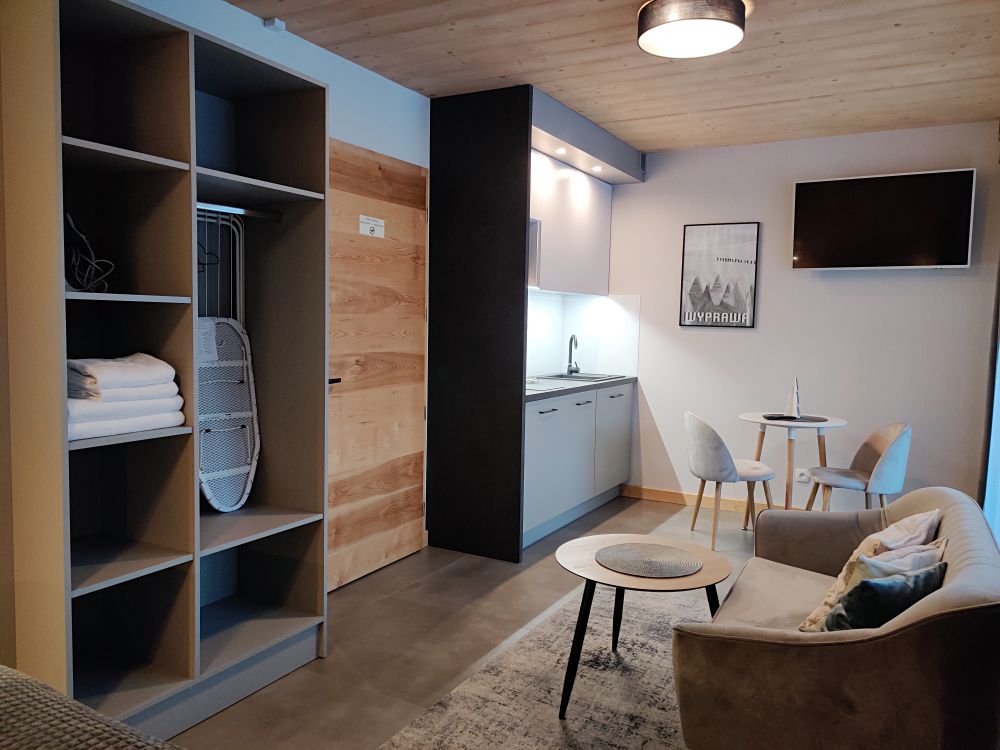 Apartament dla 2 osób, kompletnie i nowocześnie wyposażony jednopokojowy typu studio z regionalnymi akcentami . Mieści się w Willi Kozińcówka zlokalizowanej w dzielnicy Zakopanego Bystre-Koziniec w odległości ok. 1800m od górnej części ulicy Krupówki. Architektura budynku swoim charakterem nawiązuje do stylu zakopiańskiego i jednocześnie w nowoczesny sposób łączy elementy drewna, kamienia i stali. Apartament stanowi otwarta przestrzeń z aneksem kuchennym, częścią sypialną , rozkładanym fotelem i łazienka. Balkon do wyłącznego użytku.