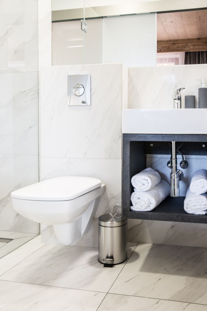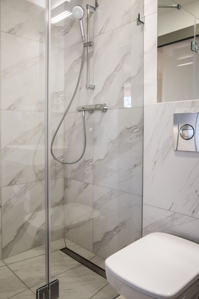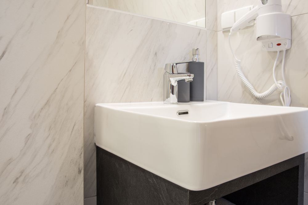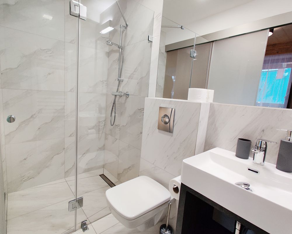 kabina prysznicowa, umywalka, toaleta, ręcznikowiec, suszarka do włosów.