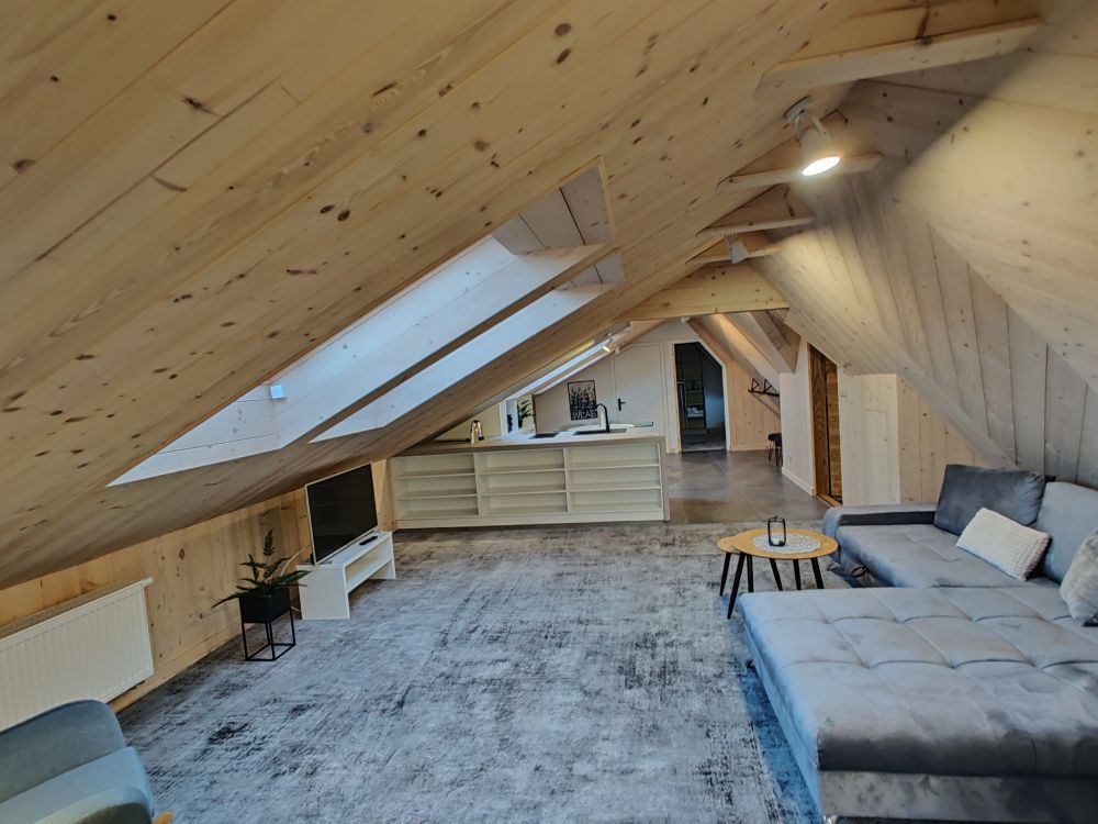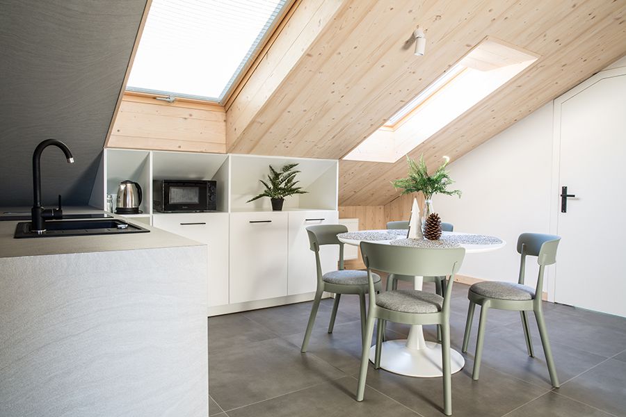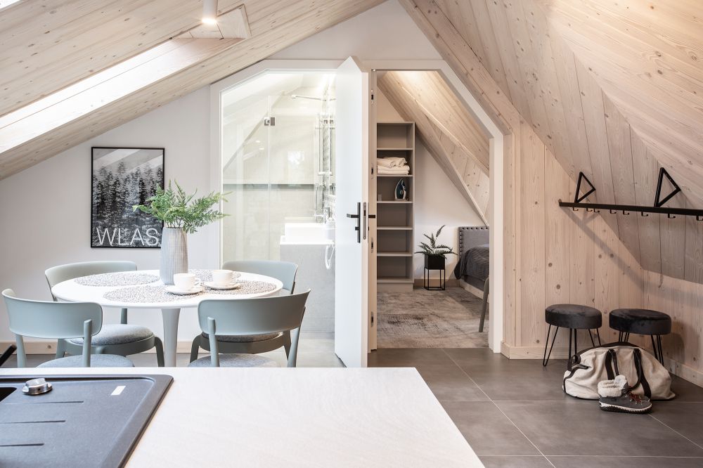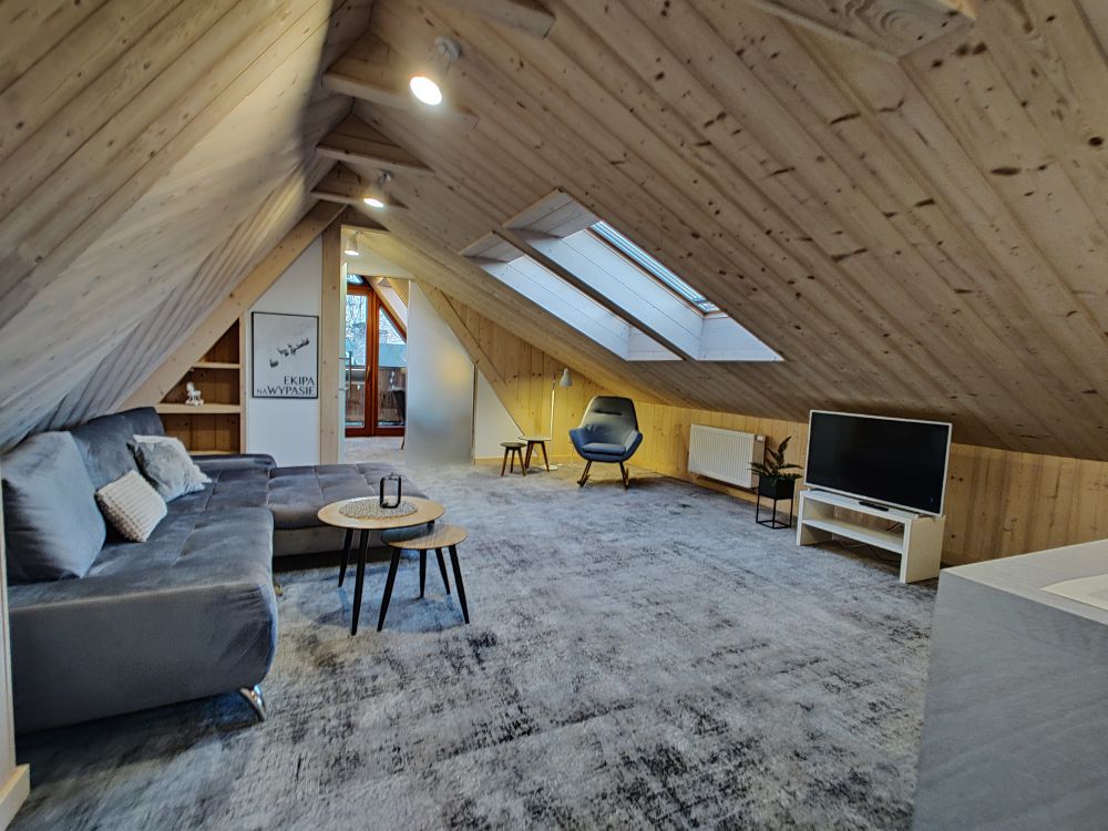 Apartament dla 6 osób, kompletnie i nowocześnie wyposażony z dwoma sypialniami w stylu regionalnym . Mieści się w Willi Kozińcówka zlokalizowanej w dzielnicy Zakopanego Bystre-Koziniec w odległości ok. 1800m od górnej części ulicy Krupówki. Architektura budynku swoim charakterem nawiązuje do stylu zakopiańskiego i jednocześnie w nowoczesny sposób łączy elementy drewna, kamienia i stali. W skład apartamentu wchodzi: salon z aneksem kuchennym i rozkładaną kanapą, dwie sypialnie , łazienka z kabiną prysznicową, balkon.